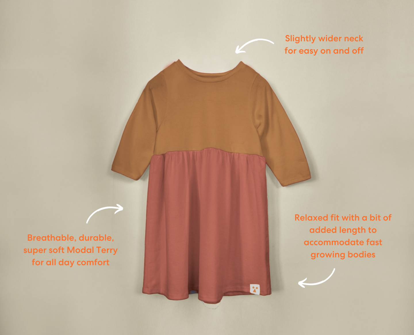 Our beloved color block dress just grew some long sleeves. Naturally soft and delightfully durable, perfect for chillier days and made to grow with your little through every season, and hundreds of washes. For all day wear (and also night, if they want).
